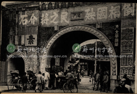阊门 位于城西北,传说天门中有阊阖,取“通阊阖风”之意而名。清初修建门楼,题以“气通阊阖”额。1934年仿金门改建罗马式城门,50年代被拆除。图为抗战沦陷时期的阊门。