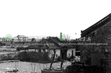 025南园景色 近处为南禅寺,远处为新市路实验小学、文庙牌楼和瑞光塔。 1955年。