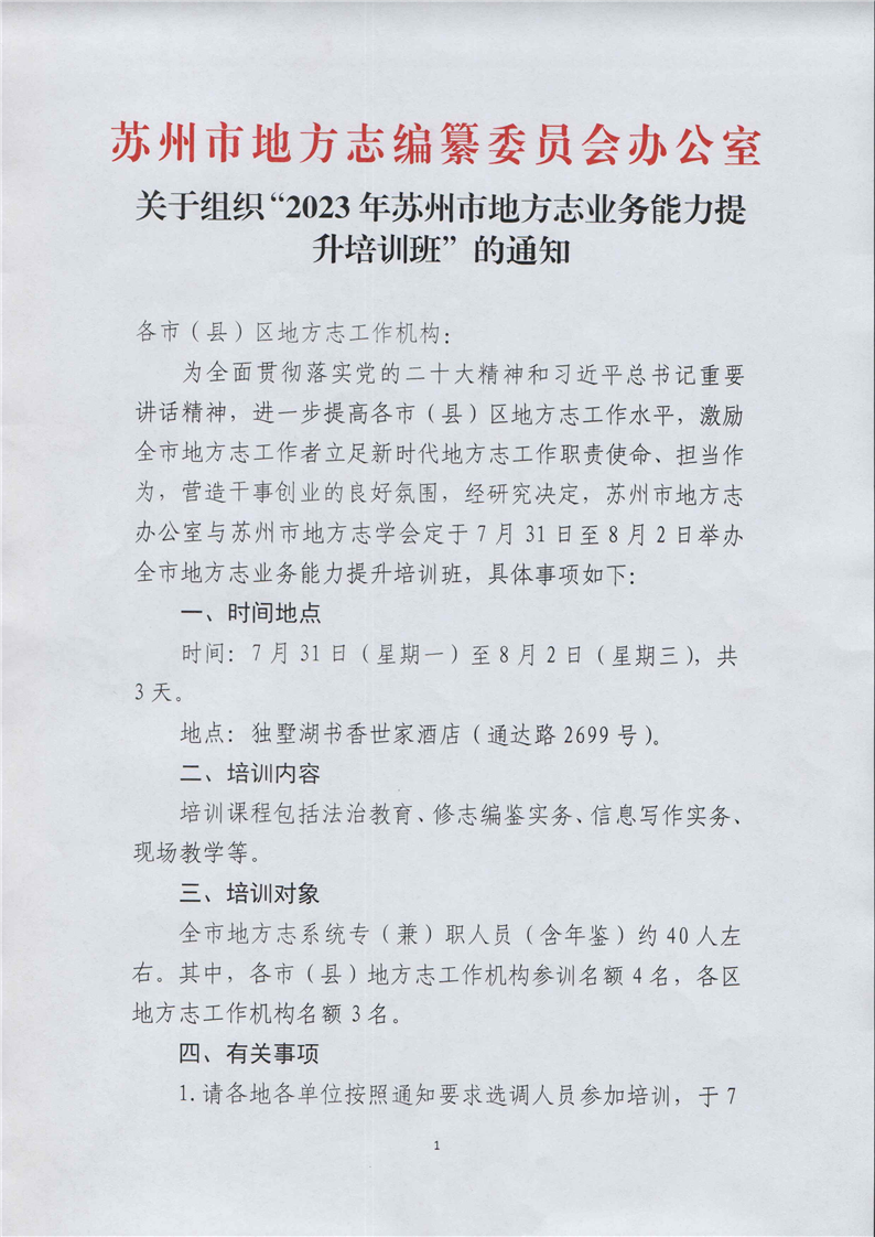 关于组织“2023年jdb电子平台市地方志业务能力提升培训班”的通知