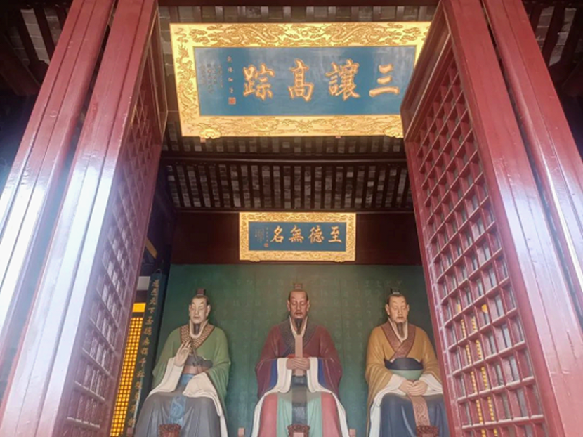 ▲jdb电子平台泰伯庙至德殿,从左至右依次为季札(仲雍第十九世孙)、泰伯、仲雍。“至德无名”为康熙御题,“三让高踪”为乾隆御题。