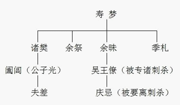 泰伯三让王位的高风亮节一直被世人称颂。因泰伯无子嗣,去世时王位传给了兄弟仲雍。吴国逐步发展,到仲雍第十八世孙寿梦继位后,吴国开始强盛起来。寿梦有四个儿子:诸樊、余祭、余昧、季札。季札是吴王寿梦第四子,仁德宽厚,知书达理,寿梦非常喜欢他,想把王位传给他。于是寿梦去世前规定四个儿子兄终弟及,诸樊、余祭、余昧相继即位。余昧去世前,要把王位传给老四季札,季札推辞不受。于是老三余昧就把王位传给了自己的儿子僚,史称吴王僚。这就引起老大诸樊的儿子公子光的不满,按照他的理解,四叔推辞王位,三叔余昧应该把王位归还到老大家,由他公子光来继位。