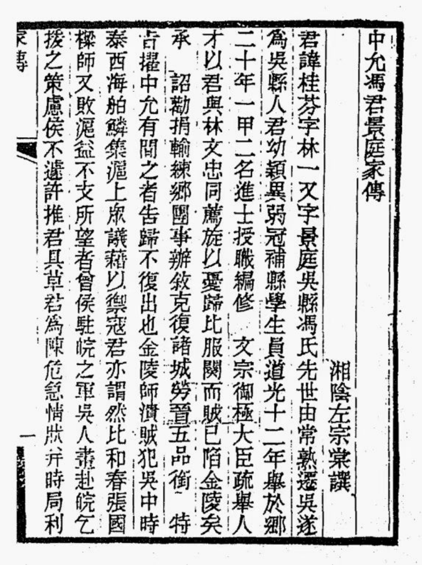 冯桂芬与左宗棠同一年考中举人,都主张经世致用、洋务运动,两人在京城赶考中相识,左宗棠称他为“同年生中有学问者”。左宗棠在浙江与太平军作战时,冯桂芬协助李鸿章在江苏与太平军作战,两人想见面却因战事未成。后来左宗棠移师西北,冯桂芬回乡著书。冯桂芬去世后,他的儿子冯芳辑写信给左宗棠,请他为冯桂芬作传。此时除被沙俄占领的伊犁外,新疆其他地区都已收复,左宗棠在哈密大营正准备与沙俄决战。虽军务繁忙,左宗棠仍欣然提笔,写下《中允冯君景庭家传》(“中允”是官职,“景庭”是冯桂芬的号)。